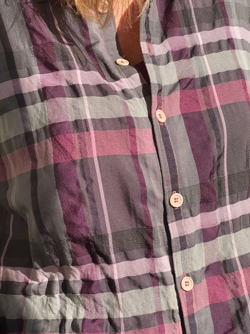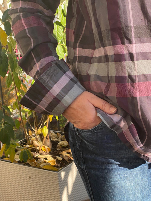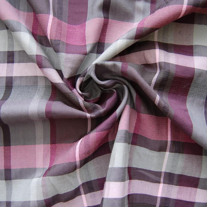 Sportives Madraskaro mit Bindungsstrukturstreifen in harmonischen Beerentönen auf grauem Fond. Bewegte Optik durch unterschiedliche Garnfeinheiten. Nutzbreite 100cm! Nachhaltig produziert in Oberfranken.