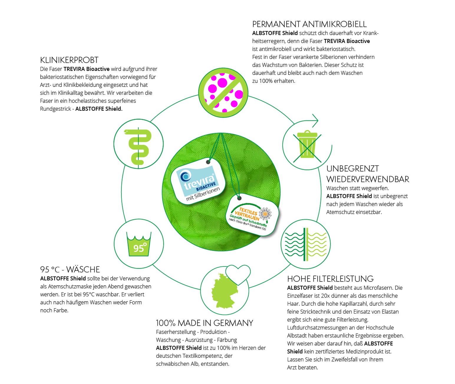 Die Albstoffe Textilingenieure empfehlen den Einsatz der klinisch getesteten und antimikrobiellen Hightech-Faser Trevira-Bioactive.
